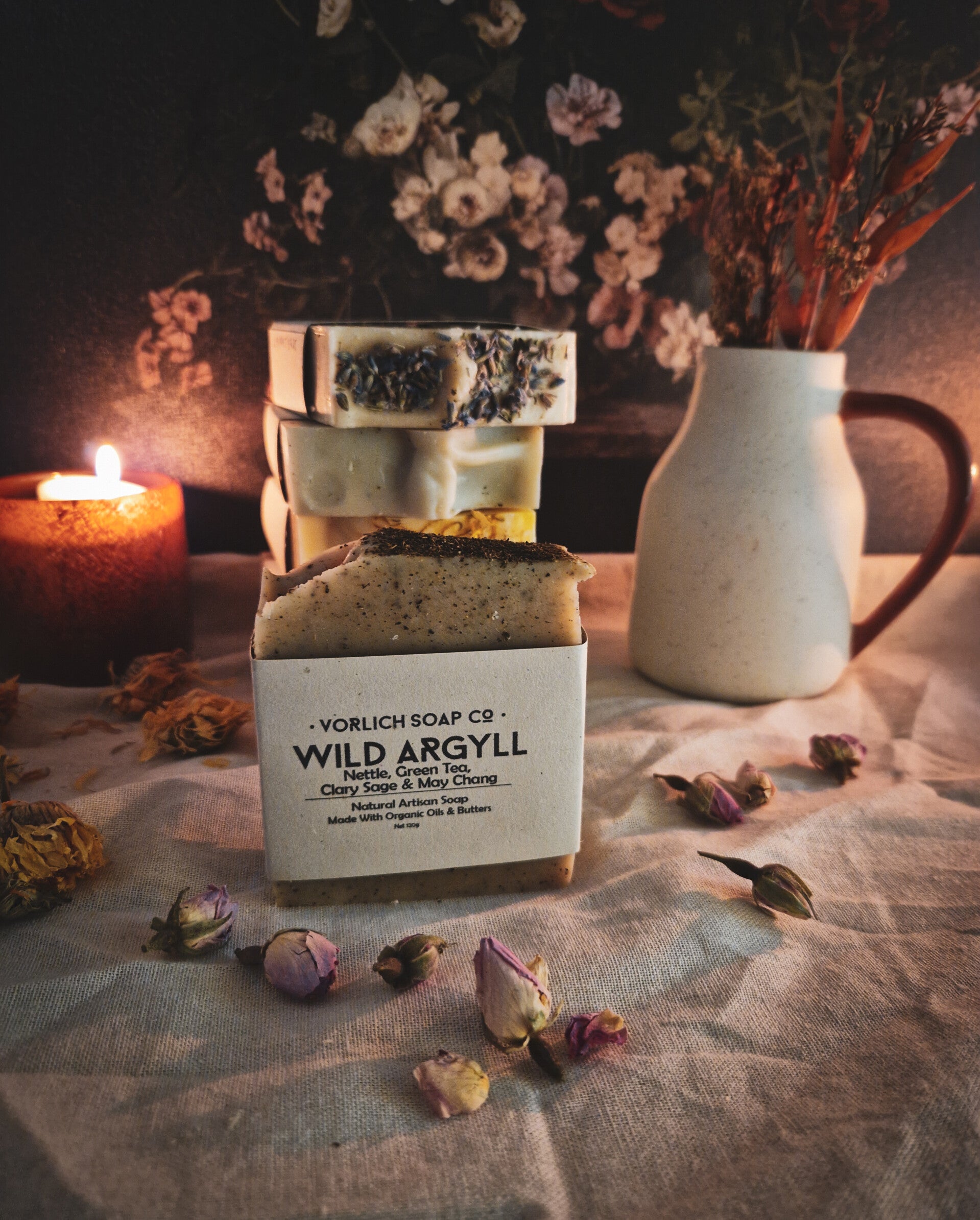 We have crafted Wild Argyll with an antioxident green tea infusion, and soothing wild nettle. This bar has the most wonderful fresh herbal aroma of may chang and clary sage essential oils.